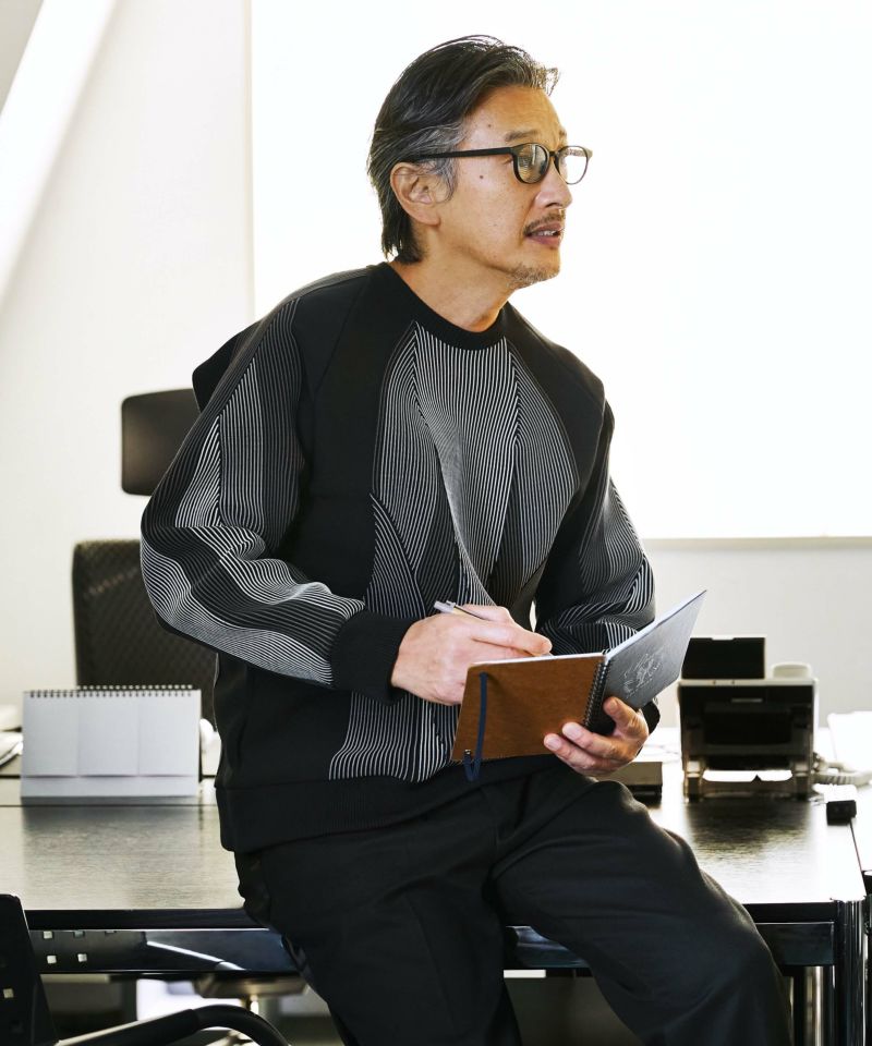 体の可動域を考慮し、異なる編地を組み合わせで出来たジオメトリックパターンが異次元の個性を創造する。