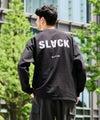 首周りは、ジャストフィットするように設計されたモックネック仕様。生地の地の目を横方向にすることで、洗濯後の型崩れを防止。裾の折り返しを広く取り、ブラインドステッチを採用。バックプリントに「SLACK」のロゴ